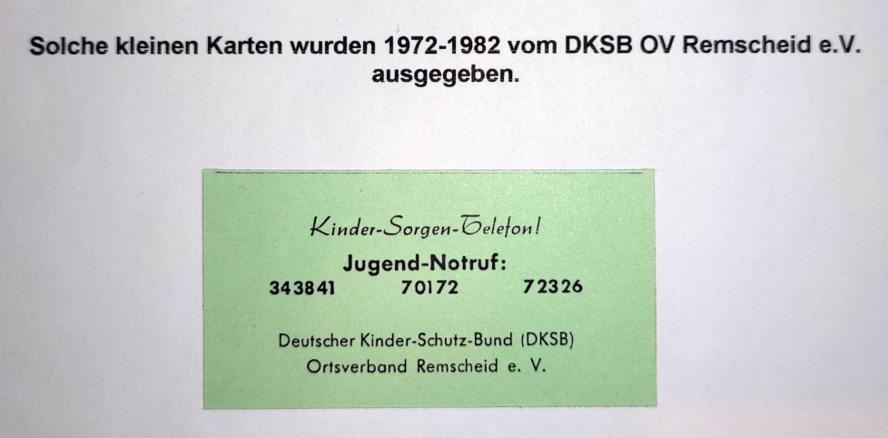1972: Im Radio hörte Uta Kleiner eine Sendung über das Kindersorgentelefon des Ortsverbandes Köln des Kinderschutzbundes. „So was brauchen wir hier auch, das fehlt uns in Remscheid“, fand die studierte Kunstmalerin, die Schülerin bei Professor Oberhoff war. Also trat sie in den Ortsverband Köln ein – kurze Zeit später wurde in Remscheid ein „Stützpunkt“ gegründet. Das reichte Uta Kleiner aber nicht. „Kinder brauchen Schutz vor einer feindlichen Umwelt“, fand sie. Gemeinsam mit Pfarrer Helmut Spengler, Renate Matera, Christa Quer, Stefan Günther und weiteren Mitstreitern gründete sie schließlich den Ortsverband Remscheid: Man schrieb den 4. Juni 1972. Die Gründer fanden sich alle im Bekannten- und Freundeskreis. Helmut Spengler kannte Uta Kleiner aus der evangelischen Kirche. Spengler hatte im „Tempel“ im Südbezirk einen Jugendtreff, zu dem täglich bis zu 180 Jugendliche strömten. Hierüber konnte man die jungen Remscheider erreichen. Es gab sonst kaum Angebote für Kinder und Jugendliche. Zudem zu wenig Hilfseinrichtungen, zu wenig Kitaplätze, auf den Rasenflächen dominierten die „Betreten-und-Spielen-verboten“-Schilder. Das Drogenproblem unter den Jugendlichen nahm zu, und die Körperstrafe war noch stark verbreitet. Die Aktiven des Kinderschutzbundes wollten sich um diese Remscheider Kinder und Jugendlichen vollumfänglich kümmern. Der erste „Jugendnotruf“, den Kleiner und Matera initiierten, lief übrigens noch über die privaten Telefonnummern. „Es riefen aber zunächst mehr Eltern als Kinder an. Daran sieht man, wie groß die Not war“, erzählt der heutige Vorsitzende Karl-Richard Ponsar. Also trafen sich die Ehrenamtler des Kinderschutzbundes mit den Eltern zur Einzelfallhilfe und zogen Experten wie Richter, Polizisten, Ärzte hinzu. Die Einzelfallhilfe gibt es übrigens auch heute noch.