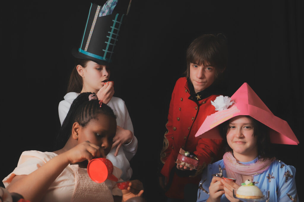 Hier haben wir Masken gebaut, wir haben gemalt, Collagen erstellt, einen Film und kleine Clips gedreht, wir haben ein Fotoshooting mit besonderen Kopfbedeckungen gehabt, wir haben zwei Interview geführt und gebacken. Ein besonderes Highlight war die Teeparty von Alice im Wunderland, die wir nachgestellt haben mit schöner Kulisse und Kostümen. Die Fotos die dabei entstanden sind haben wir unteranderem auch auf der Ausstellung gezeigt, die Rahmen und Passepartouts sind von uns selbst gestaltet worden, die Einladungskarten haben wir selbst layoutet.
