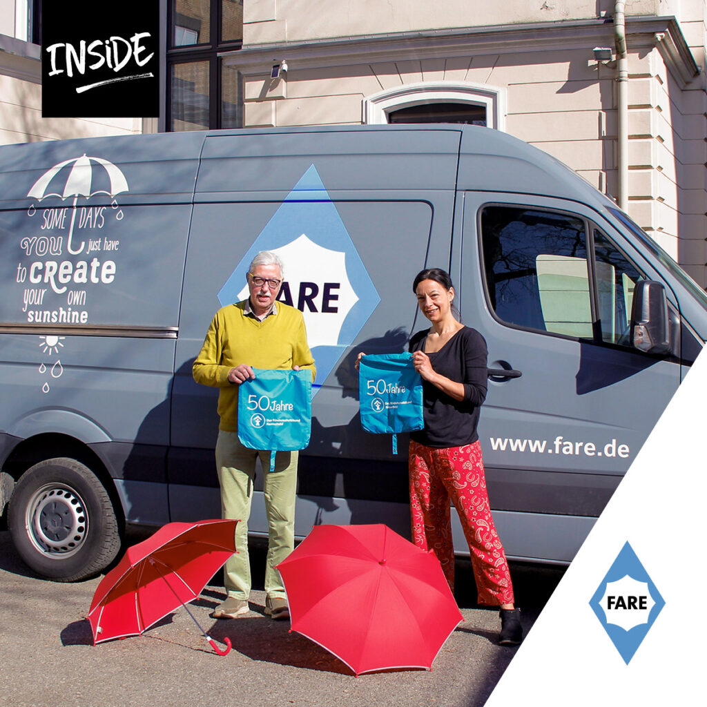 Wir danke der FARE GmbH sehr herzlich für dieses „Geburtstagsgeschenk“ und freuen uns darüber mit den Taschen einen Beitrag zur Nachhaltigkeit auch in unseren Kleiderläden leisten zu können. Und vielleicht sehen wir auch den ein oder anderen Schirm noch zu einem anderen Zeitpunkt wieder.