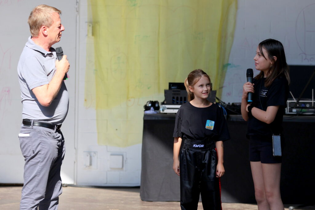 Der Oberbürgermeister musste sich auf der Bühne Kinderfragen stellen – aber gemeinsam mit den beiden Fragenstellerinnen kam er zu dem Ergebnis – Remscheid ist toll. Auch wenn er die Hausaufgaben nicht, wie gefordert, abschaffen kann.