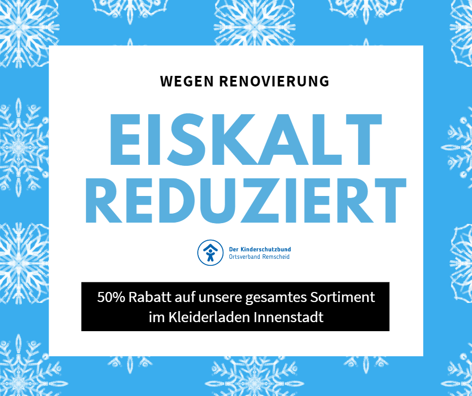 Wir renovieren unseren 𝐊𝐥𝐞𝐢𝐝𝐞𝐫𝐥𝐚𝐝𝐞𝐧 𝐈𝐧𝐧𝐞𝐧𝐬𝐭𝐚𝐝𝐭 (Zur Böckerwiese 7) und reduzieren dort deshalb „eiskalt“ unsere Preise. 𝐕𝐨𝐦 𝟏𝟐.𝟏𝟐.𝟐𝟐 – 𝟐𝟐.𝟏𝟐.𝟐𝟐 𝐠𝐞𝐛𝐞𝐧 𝐰𝐢𝐫 𝐚𝐮𝐟 𝐮𝐧𝐬𝐞𝐫 𝐠𝐞𝐬𝐚𝐦𝐭𝐞𝐬 𝐒𝐨𝐫𝐭𝐢𝐦𝐞𝐧𝐭 𝟓𝟎% 𝐑𝐚𝐛𝐚𝐭𝐭. Schnell sein lohnt sich.