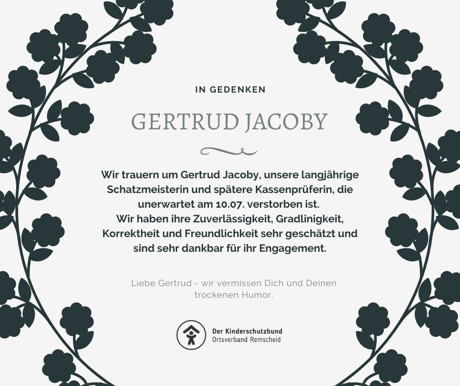 Wir trauern um Getrud Jacoby, unsere langjährige Schatzmeisterin und spätere Kassenprüferin, die unerwartet am 10.07.23 verstorben ist.